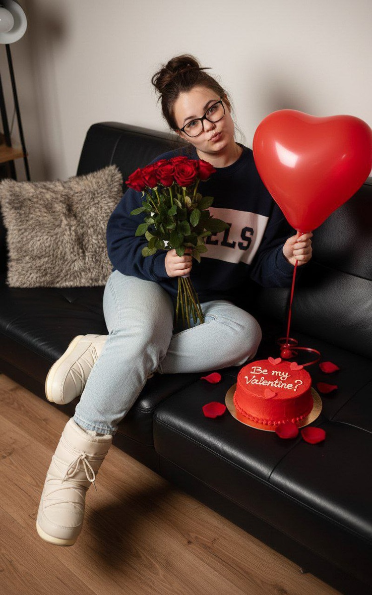 сверху под лёгким углом. Женщина расслабленно сидит на чёрном кожаном диване в гостиной, одна нога поджата, вторая вытянута. Поза непринуждённая, слегка игривая. Выражение лица с юмором и кокетством: губы слегка надуты, взгляд направлен в камеру через очки с чёрной оправой. Образ живой, тёплый, не постановочный. Волосы собраны в небрежный пучок, несколько прядей выбиваются, создавая эффект «домашнего уюта». Одежда casual streetwear: объёмный спортивный свитшот с контрастным логотипом, свободные светлые джинсы. На ногах — массивные зимние ботинки в стиле Moon Boots, слегка грубые, добавляющие ироничный контраст образу. В руках — букет свежих красных роз. В другой руке — большой красный воздушный шар в форме сердца. Рядом на диване — круглый красный торт с надписью «Be my Valentine?», вокруг разбросаны лепестки роз и маленькие сердечки. Интерьер уютный и современный: чёрный кожаный диван, декоративная подушка с мягким мехом, деревянный пол. Атмосфера домашнего праздника и сюрприза.