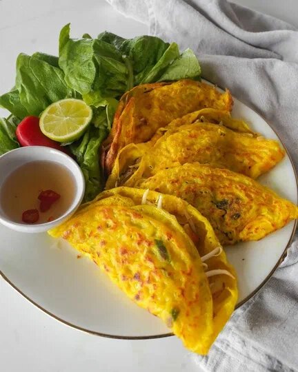 Banh Xeo — вьетнамская закуска в виде хрустящего блинчика с начинкой. Название переводится как «шипящий блинчик» из-за громкого шипящего звука, который издает тесто, попадая на горячую сковороду. Обязательный ингредиент, который добавляют в рисовое тесто - это куркума, именно поэтому блинчики получаются такого жизнерадостного желтого цвета Выпекают блинчики на сковороде с добавлением припёка — например, зелёного лука, креветок, кусочков свинины. Я попробовала ее в ресторане отеля "Амиана". Опять увидела очередь из местных туристов и решила поинтересоваться Вот на этом фото те добавки которыми можно было нафаршировать лепешку. На тарелках: Свиной паштет, овощи, соевые проростки, зелень. Несколько видов соуса. Тофу. Их пекли и сразу раздавали, свежайшие. У повара в стол вмонтирована жаровня. Вот здесь видео, можно посмотреть процесс https://vk.com/video-191505339_456239126 Вот на этом фото хорошо видно как они выглядели в ресторане отеля "Амиана". Я попробовала ее пустую, не поня