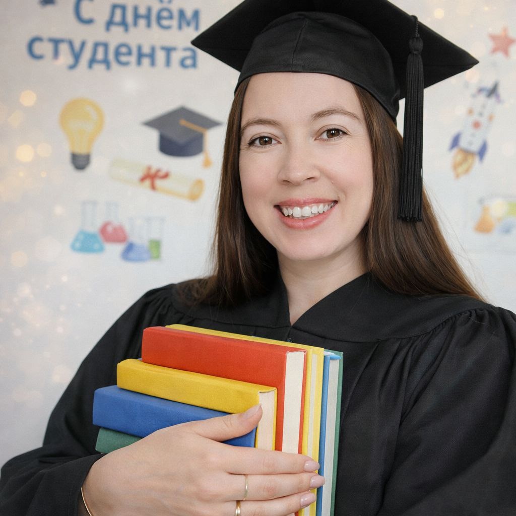 ! Сделать такую открытку можно с помощью gpt или nano banano. Ловите промт и присылайте свои фото 🔥 Промпт: Используя прикреплённую фотографию женщины в качестве референса для лица, создай ультрареалистичный портрет. Лицо женщины должно быть полностью видно, с натуральной текстурой кожи и реалистичными волосами. Не меняй фото ни на 1%. Портрет по талию, центральная композиция — женщина одета в магистерскую шапочку и мантию. Держит перед грудью стопку ярких книг обеими руками. Прижимает книги к себе. Аккуратный французский маникюр и несколько тонких колец на пальцах. Фон — белая стена, украшенная постерами, связанными со студентеством и наукой. Мягкое рассеянное тёплое освещение, боке на фоне. Глубина резкости мала (35mm/50mm эквивалент, f/1.8–2.8), высокое разрешение, реалистичные детали, мягкая виньетка. Надпись на русском языке "С днём студента". Высокое качество изображения. 8К. #промт@MKEnglishclub #промты