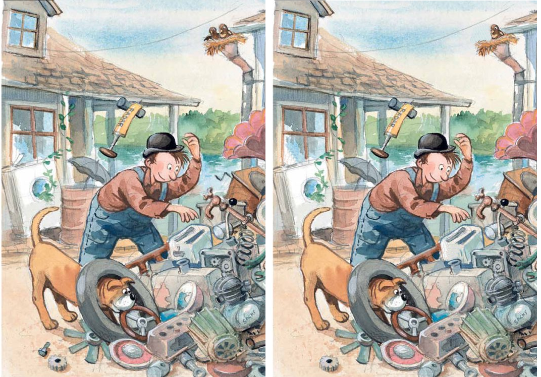 Эту книгу обожают дети 3-6 лет и просят родителей перечитывать ее снова и снова! Почему? Все просто: первая история в серии "Мулле Мек", которую придумал писатель Георг Юхансон, рассказывает о веселом изобретателе и механике Мулле Меке, его собаке Буффе и идее сделать собственный автомобиль. Мулле - мастер на все руки, который умеет, кажется, все на свете, поэтому даже такая серьезная задача ему по плечу. Из груды ржавых железок он соберет самый настоящий автомобиль – с колесами, коробкой передач, приборной доской, мотором, словом, всем-всем, без чего машине не обойтись, и подробно расскажет об этом маленьким читателям. Но кроме интересного сюжета книга очаровывает и невероятно теплыми, уютными, милыми иллюстрациями. В Мулле и Буффу влюбляются с первого взгляда и малыши, и их родители, и именно поэтому мы выбрали рисунок про этих героев для сегодняшнего выпуска игры про поиск отличий из книги "Мулле Мек собирает автомобиль". Ищите их между двумя версиями картинки, сопоставляйте, чтобы