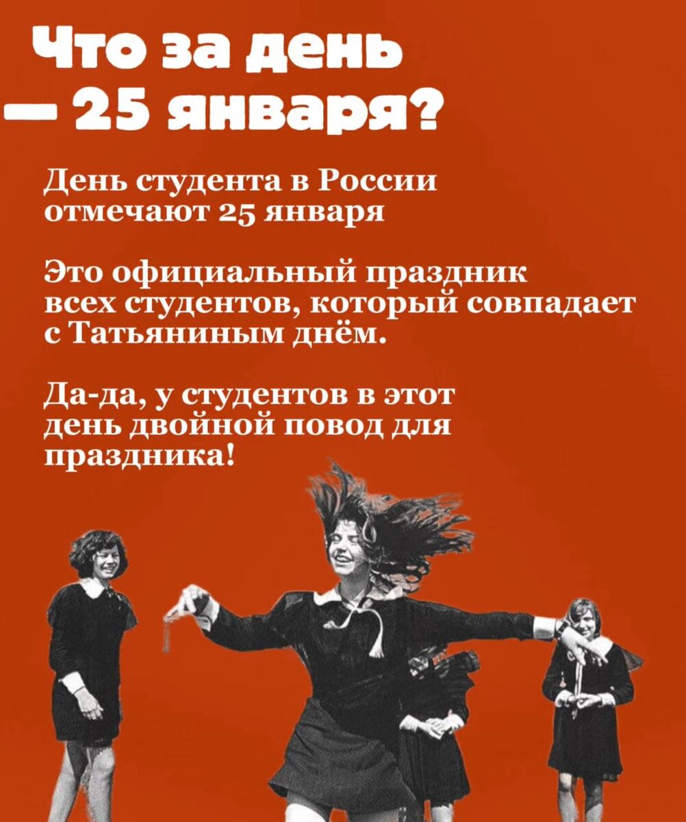 ! «1-LiNE» от всей души поздравляет всех учащихся вузов, техникумов и колледжей. Говорят, что студенчество – самая лучшая пора в жизни человека. Согласны ли Вы с этим? Напишите в комментариях. Мы же расскажем, почему праздник студентов именно сегодня, и при чём здесь Татьяны? Также на нашем сайте вышло интервью с Оксаной Мухаметшиной, которая помогает африканцам поступать в российские вузы. 🤩Новости Сибири | Прислать новость 💜 Мы в MAX