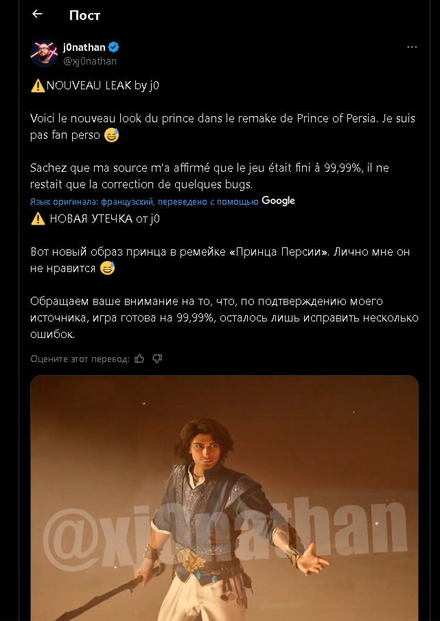 Французский блогер слил скриншот того, как выглядит новый образ главного героя ремейка Prince of Persia: Sands of Time