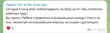 Здравствуйте, дорогие друзья! Сегодня в Бурятии потеплело! На градусниках минус 25. Но сильный ветер и кажется, что на улице холоднее. Но уже не минус 50 и это радует! И еще у нас хорошая новость. Зарплата за прошлую неделю выплачена полностью! Огромная вам благодарность за такую важную помощь! ❤️❤️❤️❤️❤️ Благодаря вам мы сегодня выкупили на Озон корм кошечкам. 10 кг сухого корма и 14 банок влажного. Заплатили 6500 рублей. От нашей Любушки на Озон поступили теплые перчатки для ребят. Огромное спасибо! Куратор Алтана Ольга прислала своему старичку вкусный подарок. Дедушка встал на лапы и прохаживается по медблоку. Но, как это часто бывает, рядом с радостью шагает грусть. Те, кто с нами давно, помнят как доставали собачку из огромного колодца, расположенного в поле. Собачка лохматая. На шее образовалось воспаление и сегодня нарыв прорвался. К сожалению, я не могу вам показать ни фото, ни видео. Их можно посмотреть у нас в Телеграмм. Олег Николаевич провел необходимую обработку раны, лап