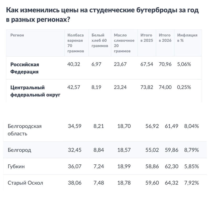 Приготовление двух порций, на которые требуется 60 граммов белого хлеба, 70 граммов колбасы и 20 граммов сливочного масла, в среднем по региону обходится в 61,5 рубля. Это на 4,7 рубля дороже, чем годом ранее. Цены различаются в зависимости от города: самый дорогой набор продуктов — в Старом Осколе (64,3 рубля), в Губкине он стоит 62,3 рубля, а в Белгороде — 59,8 рублей. При этом Белгород вошёл в топ-5 российских городов с самой низкой ценой на сливочное масло (18,5 рубля за 20 граммов). По России индекс студенческого бутерброда вырос в среднем на 5%. Его приготовление в 2026 году обходится почти в 71 рубль. Самый дешёвый вариант (53,4 рубля) зафиксирован в городе Урень Нижегородской области, а самый дорогой (131,5 рубля) — в посёлке Палана на Камчатке. Подписаться на 🗞🗞 | Поддержать бустом