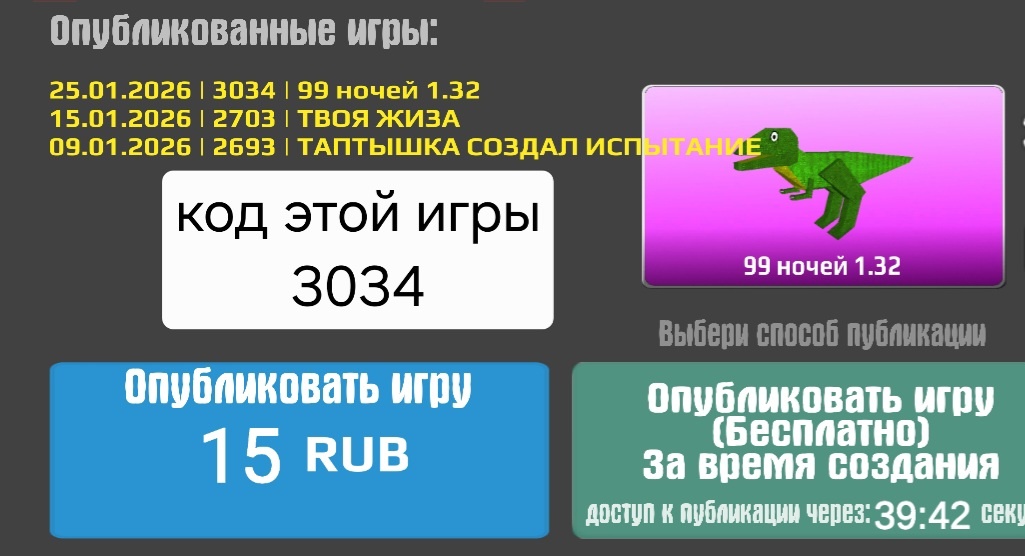 Секретный рилиз моей игры называеться 99 ночей 1.32 код 3034