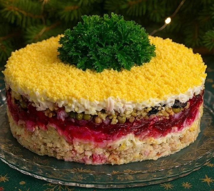 » ИНГРЕДИЕНТЫ: ✅ Куриные бёдра — 2 шт. ✅ Красный лук — 1 головка ✅ Варёная свёкла — 1 небольшая ✅ Варёный картофель — 2 шт. ✅ Консервированный зелёный горошек — 125 г ✅ Чернослив — 150 г ✅ Грецкие орехи — 75 г ✅ Яйца (варёные вкрутую) — 6 шт. ✅ Уксус 9% — 1 ст. л. ✅ Сахар — 1 ст. л. ✅ Вода комнатной температуры — 150 мл ✅ Майонез — по вкусу ✅ Соль — по вкусу ПРИГОТОВЛЕНИЕ: 1. Красный лук мелко нарезать, залить уксусом, сахаром и водой. Оставить мариноваться 10–15 минут. 2. Чернослив залить горячей водой на 5 минут, затем обсушить. 3. Установить кулинарное разъёмное кольцо диаметром 22 см на блюдо, смазать дно тонким слоем майонеза. 4. Куриные бёдра отварить, остудить, отделить мясо от костей и кожи. Мелко нарезать и выложить первым слоем. 5. Сверху распределить треть маринованного лука, смазать майонезом. 6. Картофель натереть на крупной тёрке, слегка посолить, выложить вторым слоем. Добавить ещё часть лука, смазать майонезом. 7. Свёклу натереть на крупной тёрке, посолить, выложить