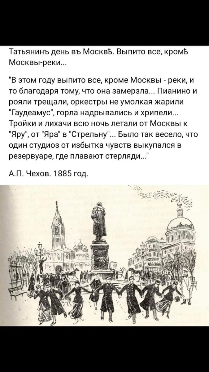 Толпы студентов до поздней ночи ходили по Москве с песнями, ездили, обнявшись, втроем и вчетвером на одном извозчике и горланили. Недаром во всех песенках рифмуется: "спьяна" и "Татьяна"! Это был беззаботно-шумный гулящий день.» В. Гиляровский «Ещё с семидесятых годов хозяин "Эрмитажа" француз Оливье отдавал студентам на этот день свой ресторан для гулянки. Традиционно огромный зал "Эрмитажа" преображался. Дорогая шелковая мебель исчезала, пол густо усыпался опилками, вносились простые деревянные столы, табуретки, венские стулья... В буфете и кухне оставлялись только холодные кушанья, водка, пиво и дешевое вино. Это был народный праздник в буржуазном дворце обжорства.» В. Гиляровский Поздравляем всех Татьян и студентов (для которых у нас в Музее Москвы сегодня, к слову, много приятных бонусов) и желаем непреодолимой и неиссякаемой тяги к знаниям! А еще предлагаем пройти наш тест «Выжил ли бы ты в дореволюционном вузе?» Делитесь результатами в комментариях! ✍️