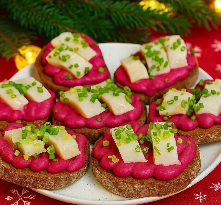 ! 🎉 🥪 БУТЕРБРОДЫ С СЕЛЬДЬЮ И СВЕКОЛЬНЫМ МУССОМ ИНГРЕДИЕНТЫ: ✅ Ржаной или бородинский хлеб — 1 багет (или 6–8 ломтиков) ✅ Филе слабосолёной сельди — 1–2 шт. ✅ Отварная свёкла — 1 шт. (средняя) ✅ Сливочный сыр (или творожный, типа «Филадельфия») — 100 г ✅ Сметана или греческий йогурт — 1–2 ст. л. ✅ Лимонный сок — 1 ч. л. ✅ Соль — по вкусу ✅ Зелёный лук — для украшения ПРИГОТОВЛЕНИЕ: 1. Подготовьте хлеб. Нарежьте хлеб ломтиками и подсушите в духовке или на сухой сковороде до лёгкой хрустящей корочки. 2. Приготовьте свекольный мусс. В блендере соедините свёклу, сливочный сыр, сметану, лимонный сок и немного соли. Взбейте до однородной, кремовой консистенции. Попробуйте — при необходимости добавьте ещё немного соли или лимонного сока. 3. Подготовьте сельдь. Нарежьте филе сельди небольшими аккуратными кусочками. 4. Соберите бутерброды. Нанесите свекольный мусс на ломтики хлеба (удобно использовать кондитерский мешок или ложку). Сверху выложите кусочки сельди и украсьте мелко нарезан