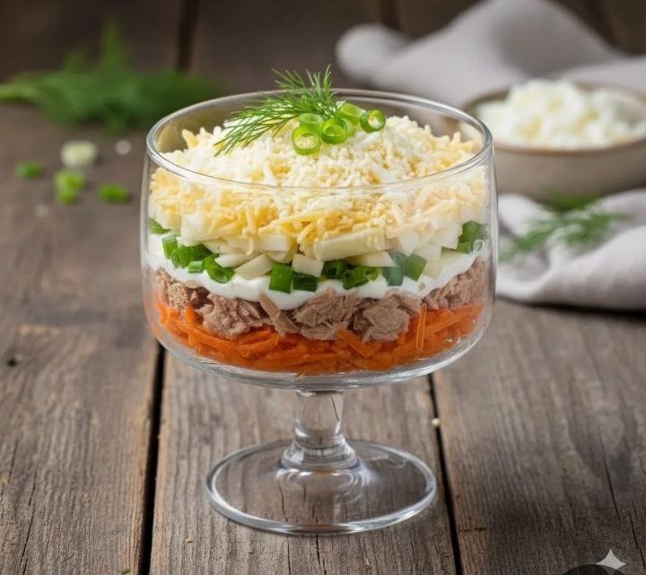 ❄️ ⏱15 минут | 145 ккал(100 г) 🛒Что нужно: 🐟Тунец консервированный (в собственном соку) — 180 г 🍏Яблоко (кисло-сладкое) — 1 шт. 🧀Сыр полутвердый — 100 г 🥚Яйца вареные — 3 шт. 🥕Морковь отварная — 1 шт. 🌱Зеленый лук — небольшой пучок 🥣Майонез или густой йогурт — 3 ст.л. 👩🍳Как готовить: Слейте жидкость из тунца и разомните рыбу вилкой. Яйца, сыр и морковь натрите на мелкой терке. Яблоко очистите от кожуры и натрите в последнюю очередь, чтобы не потемнело. Выкладывайте слоями, смазывая каждый (кроме рыбного) тонкой сеточкой майонеза: морковь, тунец, измельченный зеленый лук, яблоко, сыр и сверху тертые яйца. Дайте пропитаться в холодильнике хотя бы полчаса.
