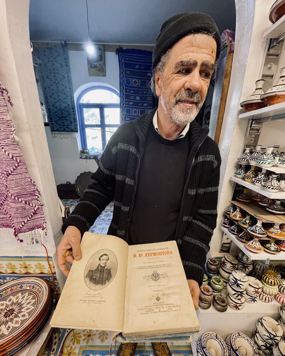 По мифам Древней Греции, его основал великан Антей. В реальности же это были колонисты из Карфагена в V веке до н. э. С тех пор город-порт переходил от берберов к римлянам, от римлян к арабским династиям, а далее — к португальцам, англичанам, французам. В 1923 году Танжер официально стал Международной зоной, управляемой несколькими европейскими державами. Этот статус сильно повлиял на культуру, литературу и туризм. Город стал одним из крупнейших финансовых центров мира, сюда съезжались писатели, поэты и художники. Сегодня в Танжере можно найти осколки, пожалуй, всех мировых культур. На этом фото от Дмитрия Беркута (dimaberkut) показан продавец в одном из магазинов керамики. Он услышал русскую речь посетителей и вынес полное собрание сочинений М.Ю. Лермонтова 1883 года (!) от издательства Маврикия Осиповича Вольфа. Оно было одним из крупнейших в дореволюционной России и за свою историю выпустило порядка 4000 книг большими тиражами. И вот одна из тех книжек проехала полмира и оказала