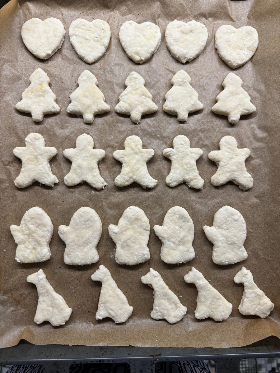 * Формовка: Раскатайте пласт толщиной около 0,5 см. Вырезайте печенье любимыми формочками или обычным стаканом.