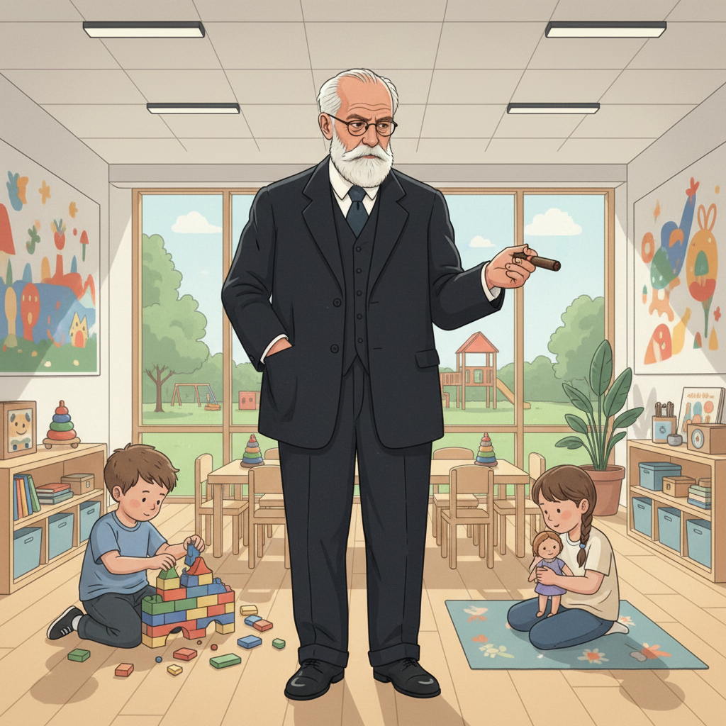 Я никогда не думала, что однажды буду идти по детскому саду рядом с Зигмундом Фрейдом. Он — в строгом костюме, с тростью, с сигарой, которую, к счастью, не закурил (воспитатели строго смотрят на всё, что хоть отдалённо напоминает дым). А я иду с блокнотом в кармане и внутренним вопросом: «Что он увидит здесь, чего не вижу я?» Мы вошли в подготовительную группу. Дети этого возраста уже умеют читать по слогам, но ещё верят, что под кроватью живёт добрый монстр, который охраняет их сны. Фрейд остановился у двери. Его взгляд скользит по комнате: по кукольному театру, где девочка шепчет кукле: «Ты больше не будешь меня наказывать», по мальчику, который яростно ломает конструктор, потому что «он не такой, как надо», по ребёнку, который сидит в уголке и рисует… что-то тёмное, с глазами. - Латентная фаза, - произнёс он почти шёпотом. - Но не спокойствие. Только пауза. Я кивнула. Вспомнила его теорию психосексуального развития: в 6–7 лет, по Фрейду, сексуальная энергия (либидо) временно «засыпа