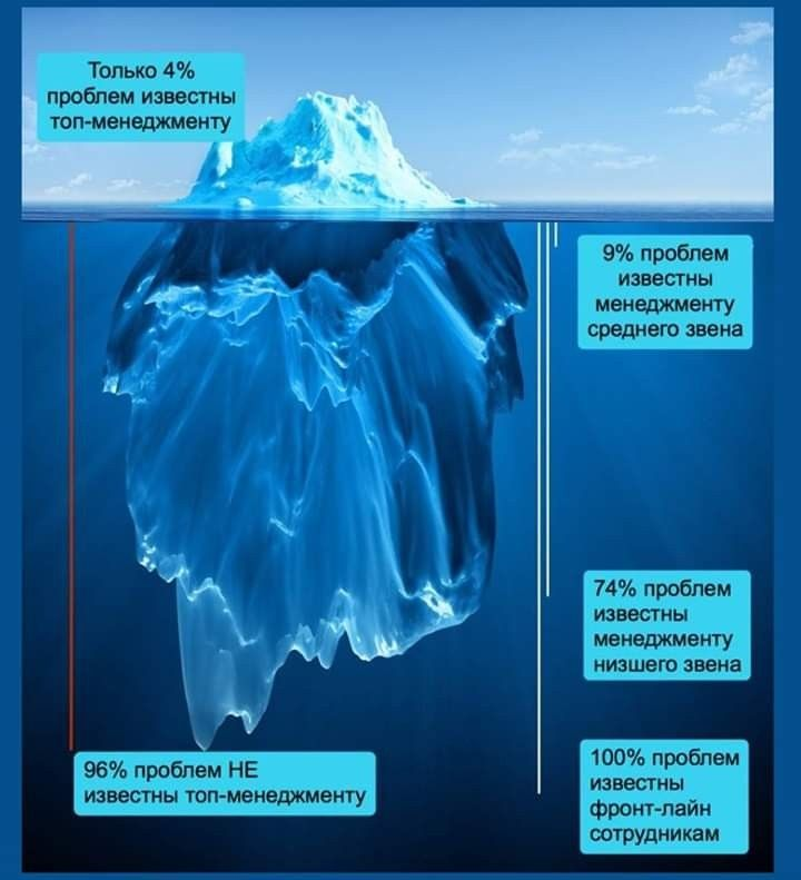 Знакомая эта картина? Генеральный директор на совещании уверенно оперирует цифрами: план выполнен, ключевые показатели растут. А через неделю компания теряет крупного клиента из-за ерундовой ошибки в логистике, о которой все давно знали. Кроме самого директора конечно) Исследования показывают, что на самом деле, топ-менеджеры в среднем видят лишь 4% реальных проблем компании. Среднее звено знает о 9% проблем. Руководители на местах в курсе уже 74% сложностей. А полную картину, все 100% ежедневных сбоев, нестыковок и клиентских жалоб, видят только те, кто находится на передовой — фронтлайн-сотрудники.почему вы видите только 4% проблем и как это исправить Почему так происходит и, главное, что с этим делать? Представьте огромный фильтр, установленный на каждом этаже офиса. На самом верху там самое мелкое сито. Как это выглядит на деле? Сотрудник видит проблему и думает: «Стоит ли говорить?».