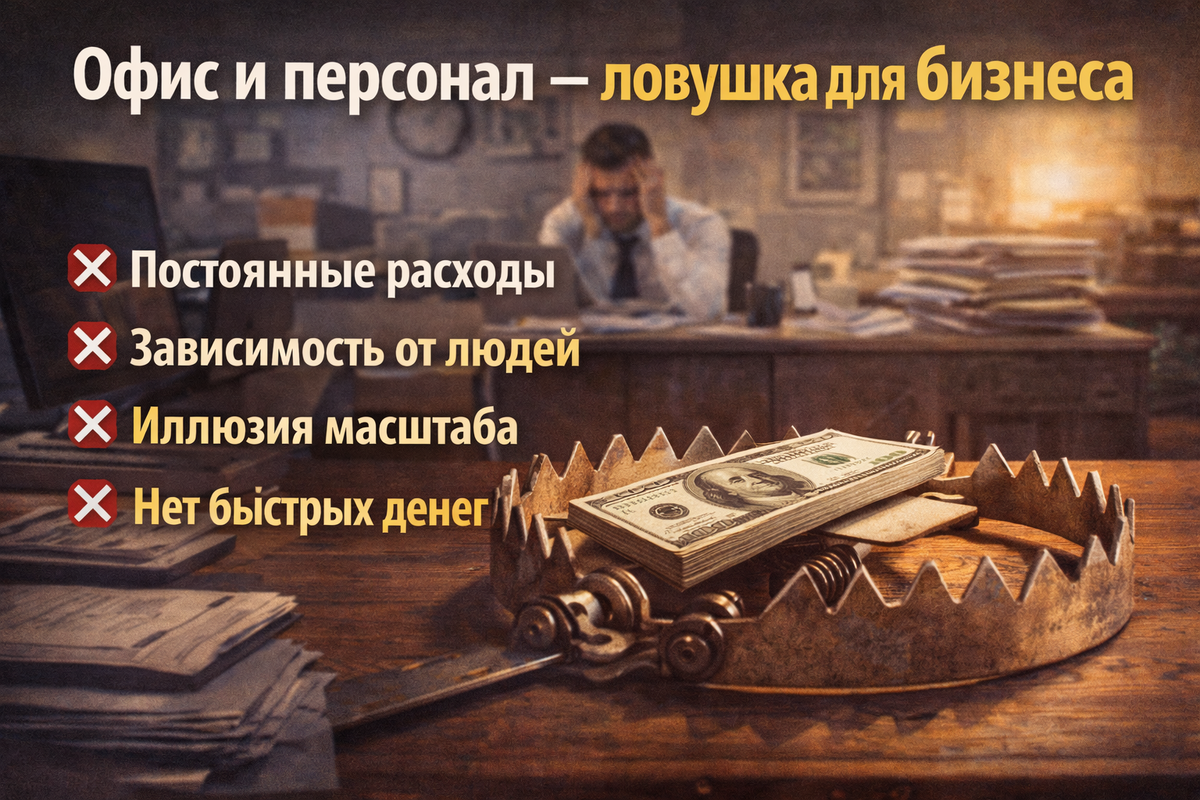 офис, сотрудники, вывеска, рабочий день с 9 до 18. И именно эта картинка чаще всего становится причиной провала на старте. Разберёмся, почему классический бизнес с офисом и персоналом — это ловушка, особенно для новичков и малых городов. Потому что: В голове есть установка: «Если нет офиса и сотрудников — это не бизнес». Но реальность давно изменилась. Офис и персонал — это фиксированные затраты, которые не зависят от дохода. Вы платите: Даже если: Деньги уходят каждый месяц, а доход может появиться неизвестно когда. Новички сильно недооценивают человеческий фактор. Сотрудники: В малых городах это особенно критично: В итоге бизнес начинает зависеть не от модели, а от конкретных людей. Офис создаёт ощущение: Но по факту: Многие бизнесы выглядят «красиво», но не зарабатывают. Классический сценарий: И только потом: На это уходят: Новички просто не доживают до точки окупаемости. Потому что: Ошибка в одном элементе рушит всю конструкцию. Дл