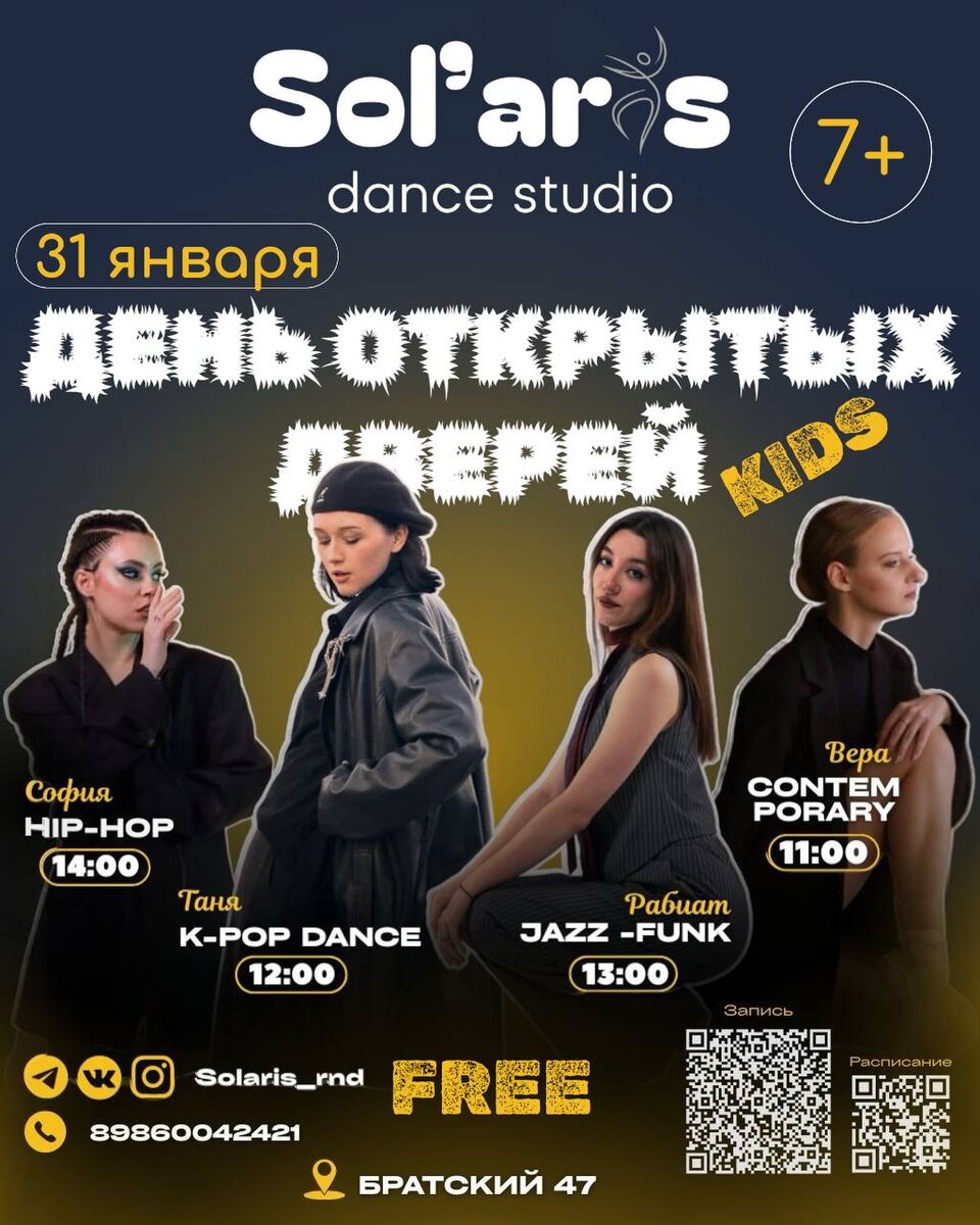 ! 🎉 В рамках мероприятия запланирована серия ознакомительных занятий по различным танцевальным направлениям для детей и подростков (7-15 лет) Программа мастер-классов: 1️⃣K-POP DANCE: изучение основ хореографии в стиле популярных азиатских поп-групп 2️⃣HIP-HOP: освоение базовых элементов уличных танцев и ритмики 3️⃣JAZZ FUNK: работа над координацией и стилистикой современного танца. 4️⃣CONTEMPORARY: развитие пластики, изучение техник современного балета и йоги. 🗓 Дата: 31 января 🕚 Время: с 11:00 до 15:00 📍 Место: Танцевальная студия «Солярис», Братский 47 🤳Условия: Вход свободный по предварительной регистрации. Справочная информация: *Уточнить наличие мест и получить дополнительную информацию можно здесь: 📞 89860042421 👨🏻💻 @Solaris_rnd_offical *запись осуществляется по QR в афише, прямая ссылка на форму 👈🏼