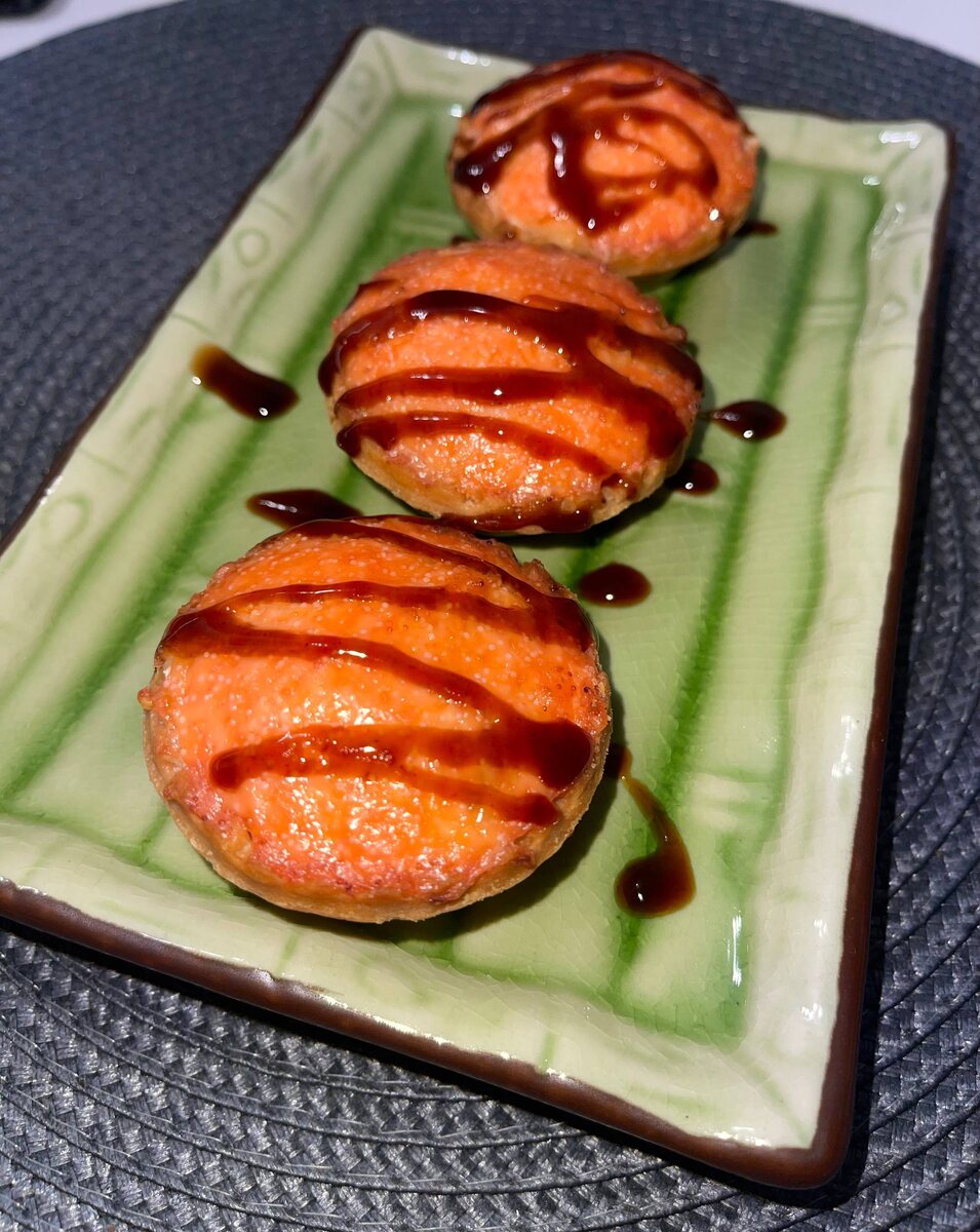 Ингредиенты: Крабовые палочки Сыр твердый Лист нори Сыр плавленный Икра с копченой форелью Тарталетки песочные Соус терияки или унаги Приготовление: Мелко нарезаем крабовые палочки, сыр натереть на крупной терке. Порезать мелко лист нори и заправить сливочным плавленным сыром (типа viola). Все хорошо перемешать и выложить в тарталетки, без «горочки». Сверху выкладываем шапочкой икру. Запекать в духовке 20-25 минут при температуре 180° или до золотистого цвета. Если у вас дома есть аэрогриль, то ставим режим 10 минут и температуру 200°. Готовые тарталетки покрываем соусом. Приятного аппетита🌺 #японамать #тарталетки #антисуши