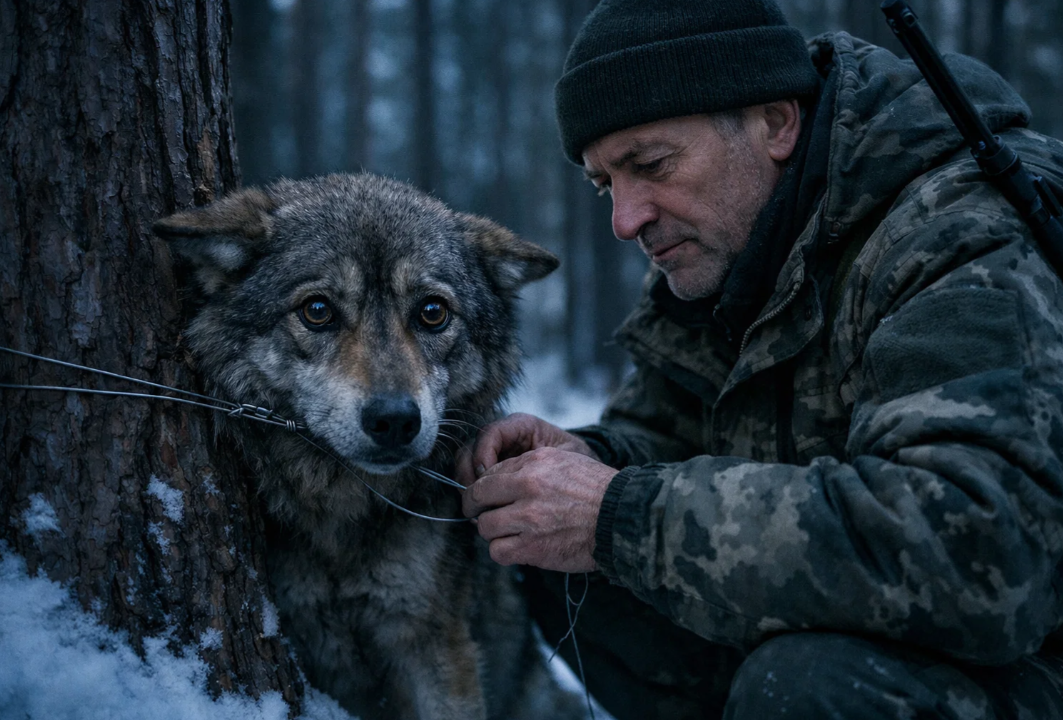 Но он не ушёл. Она чувствовала это всем истерзанным телом: чужое присутствие оставалось рядом, пряталось в тени, следило. Из её груди вырвался тихий, почти неслышный скулёж — не угроза и не зов, а слабая просьба о помощи. И лес ответил. Пёс снова показался, уже без злобы, осторожно приблизился и принялся обнюхивать неподвижную пленницу.