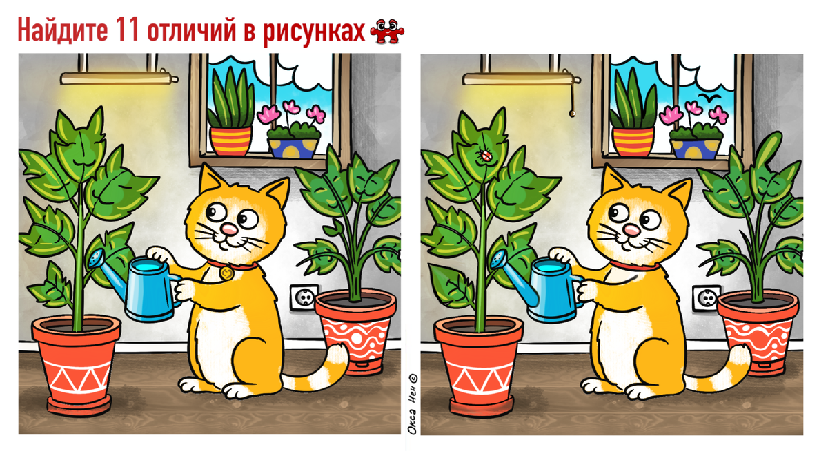 Тест на внимательность - 11 отличий на картинках про кота-садовода