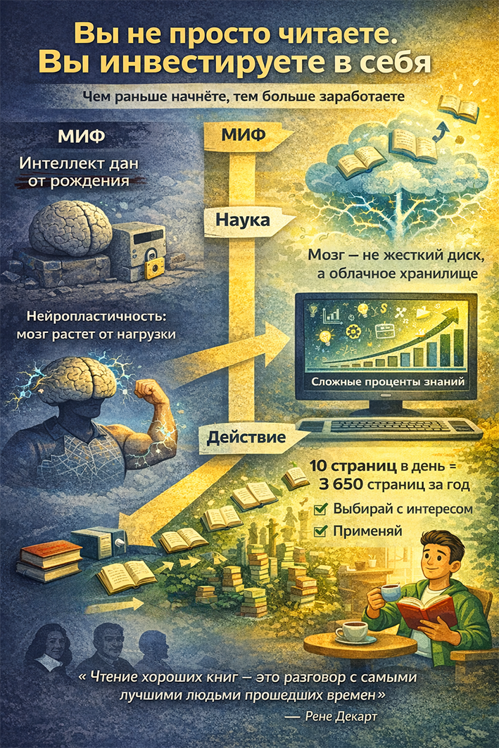 Представьте, что ваш мозг — это банковский счёт, на который капают проценты. Только вместо денег — знания. И чем дольше вы вкладываетесь, тем мощнее итоговая сумма. Звучит как сказка? На самом деле — чистая наука. Давайте разбираться! Ещё недавно учёные уверяли: Но тут пришла нейропластичность и всё перевернула! Оказалось, мозг — не статичная глыба, а мускул, который растёт от нагрузки. Доказательства, от которых челюсть падает: «Ваш мозг — не жёсткий диск с фиксированным объёмом. Это облачное хранилище, которое расширяется по мере использования». Помните правило сложных процентов? Если вложить 1 млрд руб. под 20 % годовых, через 20 лет будет 38 млрд! То же самое с знаниями. Пример: А если читать 50 книг в год (как делал я), эффект становится взрывным. Новые знания цепляются друг за друга, как зомби из примера ниже, и ваш интеллект растёт лавинообразно. Почему это работает?
