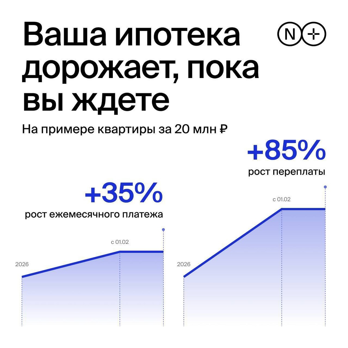 ? С 1 февраля семейная ипотека станет жестче. Ключевые изменения: • Одна семья - один займ (больше не получится оформить два на супругов). • Учитывается кредитный рейтинг обоих. • Следующий прогнозируемый шаг - рост ставок в зависимости от количества детей. Для семьи с одним ребенком ставка может подскочить с 6% до 10%. И это не просто цифры - это другая финансовая реальность на 20 лет. 🔹 Сценарий «Сейчас» (ставка 6%) Квартира: 20 млн ₽ Первоначальный взнос: 2,4 млн ₽ Платеж в месяц: 68,7 тыс ₽ Переплата за 20 лет: 6,9 млн ₽ 🔹 Сценарий «Потом» (ставка 10%) Квартира: те же 20 млн ₽ Первоначальный взнос: те же 2,4 млн ₽ Платеж в месяц: 92,6 тыс ₽ (+24 тыс ₽ ежемесячно!) Переплата: 12,6 млн ₽ ➡️ Итоговая переплата вырастет на 5,7 млн ₽ Промедление сейчас - это не просто ожидание. Это осознанное решение переплатить миллионы. Чтобы вы успели принять взвешенное решение, ПИШИТЕ мне и мы разберем Ваш вариант.
