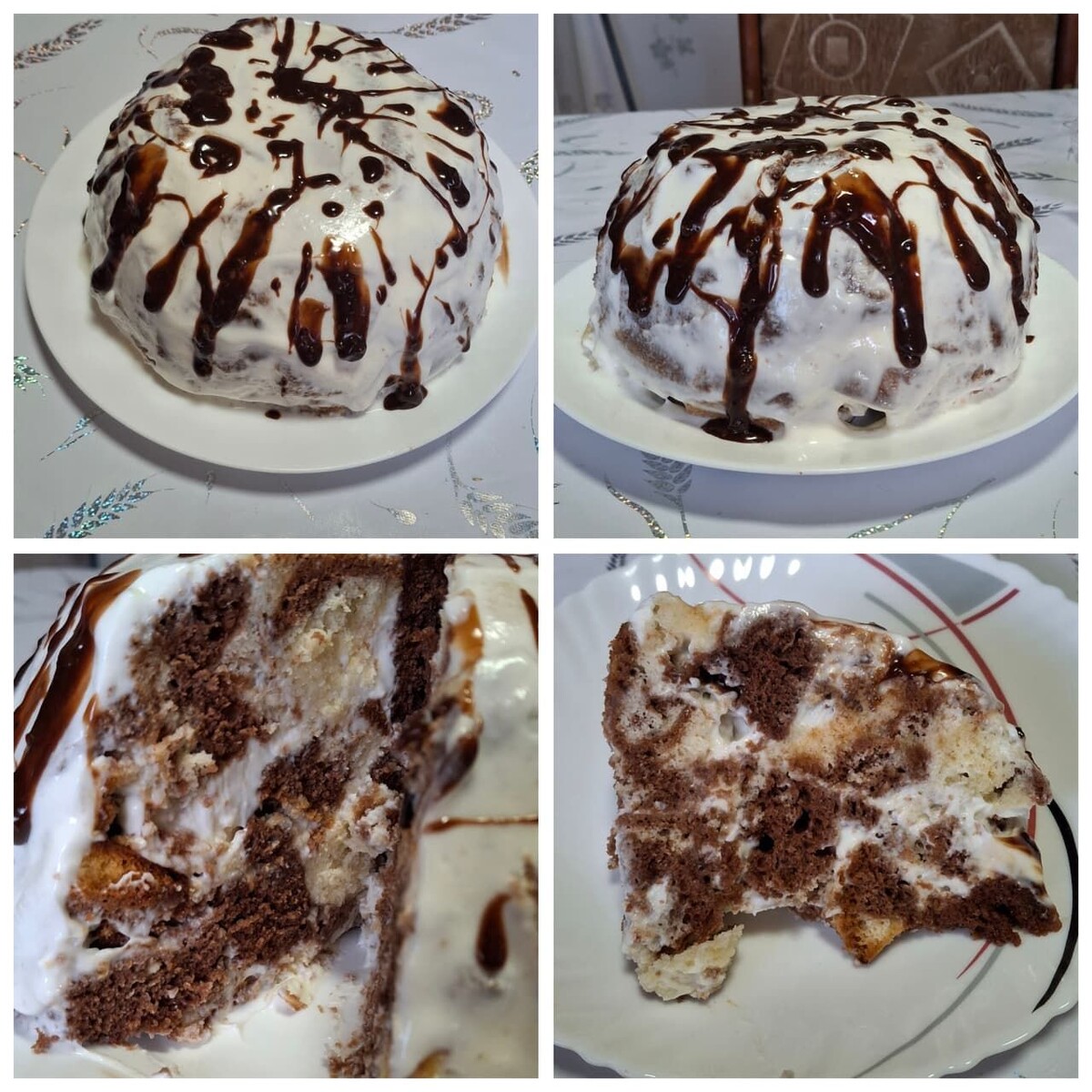Камыр өчен кирәк була: Йомырка – 4шт Шикәр комы -140гр Сметана – 3 аш кашык Сгущенка – 0,5 банка Разрыхлитель – 1 пачка Он – 250 гр Крем: Сметан 20% – 500-600гр Шикәр комы – 100гр Бизәр өчен: Молочный шоколадны эретеп или каты килеш кырсаң да була. Эш барышы: йомырка белән шикәр комын бергә көбекләнгәнче болгатасы,сметан һәм разрыхлитель, сгущенка салып тагын болгатасы, җайлап онны кушасы. Духовкада 180 градуста 20 минут тирәсе пешерәсе. Пешеп суынгач, шакмакларга кисеп, сметанга манып аласы һәм 2 литр тирәсе табакка пакет киертеп, пакетны бераз кремлап, шакмакларны тезә барасы. 2 сәгать холодильникта тора, алгач тәлинкә куеп төбенә каплап, пакетны аласы һәм калган крем белән бизисе.