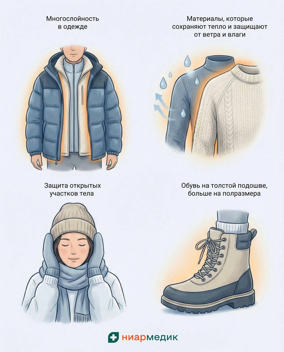 ❄️ 1️⃣ Принцип слоёв: — первый слой отводит влагу (термобельё); — второй – сохраняет тепло; — третий – защищает от ветра и влаги. 2️⃣ Правильные материалы: для термобелья лучше всего подходят полиэстер, флис, спандекс. Шерсть и современные синтетические ткани отводят влагу от кожи и помогают сохранять тепло. ❌ А вот хлопок не рекомендуется: он впитывает влагу и быстро охлаждает тело. 3️⃣ Защищайте открытые участки тела: шапка, закрывающая уши и шею, шарф и тёплые варежки — обязательны. Перчатки из натуральных материалов удобны, но в сильный мороз плохо защищают от холода. 4️⃣ Обувь должна быть на полразмера больше. Если пальцы не двигаются, нарушается кровообращение – и ноги замёрзнут даже в самых тёплых ботинках. ⚠️ Не закрывайте рот и нос шарфом или варежкой. Влага быстро накапливается, ткань и кожа намокают — и лицо переохлаждается ещё сильнее. Берегите себя и своё здоровье зимой ☺️ 🤍