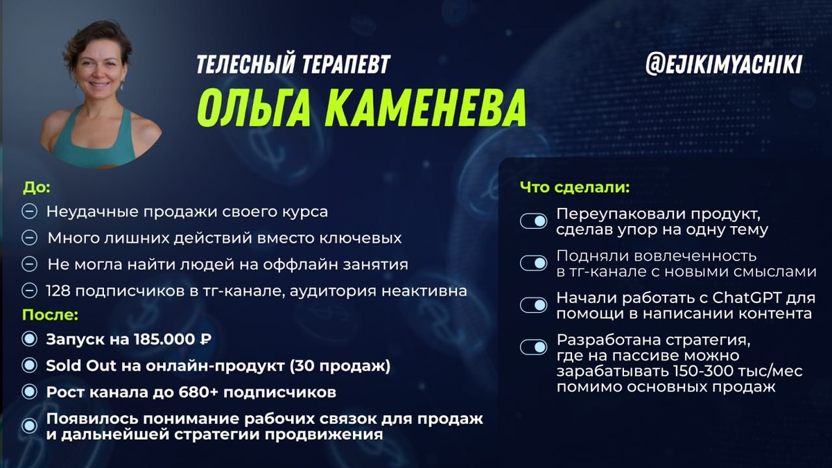 со средним чеком 7 000 Или сила ключевых действий Выходной решила начать с мотивации для вас, поэтому поделюсь кейсом эксперта с мастер-группы, у которого до группы были неудачные попытки продаж онлайн и полная демотивация идти в эту историю повторно. Телесный терапевт — Ольга Каменева ➡️До: - канал 128 подписчиков - неудачный запуск с кучей ненужных действий и трат - продаж с канала практически нет - группы оффлайн не собираются ➡️После: - канал 680 подписчиков - запуск на 185К - полная запись на оффлайн - разработана стратегия масштабирования на 150-300К на пассиве ➡️Что мы сделали, чтобы получить такой результат: - Разработали сильное позиционирование, которое привлекает нужную аудиторию и выделяет эксперта от коллег - Пересобрали продукт, который был - Пересобрали контент: убрали сложные термины, с помощью Cast Dev поняли боли и желанию аудитории и сделали тексты проще и понятнее. Появился язык, который близок её аудитории. Тексты стали лёгкими и интересными. - Сделали из канала во