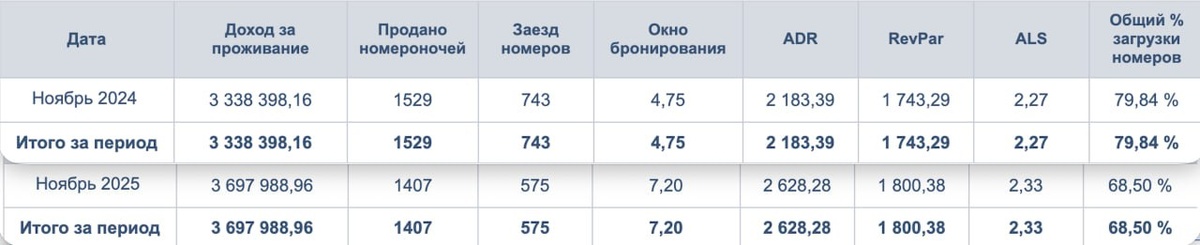 Итоги ноября 2025 Загрузка в текущем году ниже на 11%. На протяжении 3 месяцев картина стабильна - то есть тренд очевиден. Ежедневный доход RevPar вырос на 57 руб Если сравнивать месячную выручку, то приросла на 360 тыс руб., что очень скромно и ниже инфляции. Традиционно необходимо сравнить 2024 и 2025 годы, и там картина следующая: В 2024 году ноябрь был убыточен на -418640 руб В 2025 году ноябрь принес 103 437 руб. Здесь существенная разница - 2025 год стал прибыльнее на 521 тыс руб выше. Но это скорее не заслуга месяца или выручки, которую мы сделали. Здесь мы направили внимание на то, чтобы не повторять убыточных месяцев и стали управлять расходами так, чтобы всегда был положительный результат. Так же с этого месяца мы внедрили отчет по доходности каждого объекта. Для этого берем выручку и вычитаем из нее прямые расходы. Так виден результат каждого объекта, что бы по нему принимать решение - что делаем дальше. Как вы проводите оценку эффективности своей работы?