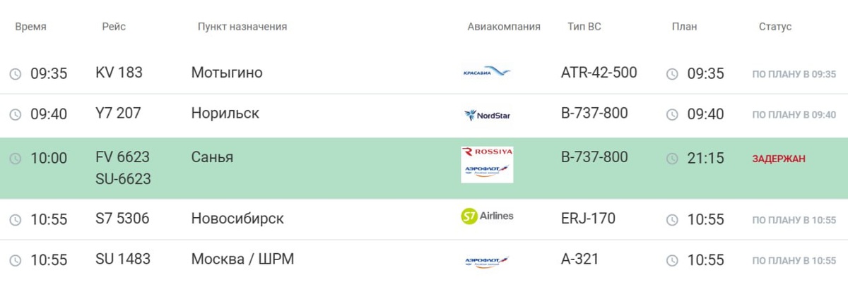 Рейс Красноярск–Санья снова перенесли На этот раз – на 26 января, следует из данных онлайн-табло аэропорта Красноярск. Пассажиры делятся, что теряют дни отдыха: «Рейс снова перенесли на 10 утра завтра. Запасного борта так и нет. На Флайтрадаре ничего запасного не летит. В самом Красноярске с утра стоит 2 борта "России", в течении дня никуда не летали. Ну не могут же они оба сломаться. У людей украли 2 дня отдыха уже...». ТВК