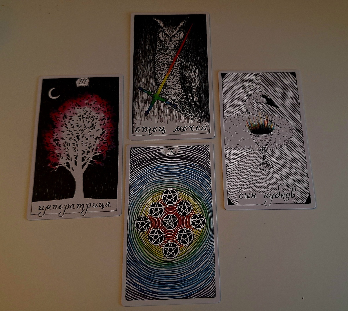 Расклад получился мощным, "взрослым" и очень заземленным: Императрица, Отец (Король) Мечей, Десятка Пентаклей и Сын (Рыцарь) Кубков.