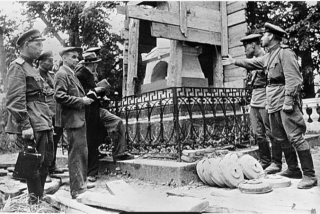 Святогорский монастырь, где покоится прах Александра Сергеевича Пушкина, был захвачен немецкими войсками 12 июля 1941 года. Три года спустя, отступая, оккупанты обратили в руины весь мемориальный комплекс, а могилу национального гения заминировали с поистине садистской изощренностью. К началу войны территория Святогорского монастыря с могилой поэта входила в состав музея-заповедника «Михайловское». Что удивительно, в первые годы оккупации музей… продолжил работу. Немцы даже интересовались творчеством Пушкина — многие солдаты видели немецкую экранизацию «Станционного смотрителя» 1940 года. Однако культура была лишь прикрытием. Назначенный в 1942 году хранителем лесовод Кузьма Афанасьев был бессилен против систематического грабежа. Обер-фельдфебель Фоссфинкель безнаказанно вывозил из усадьбы антиквариат, картины и книги. А осенью 1943 года, по приказу коменданта Трайбхольца, в Германию на 10 грузовиках отправили всё остальное. К февралю 1944-го «Михайловское» стало военной зоной: для стр
