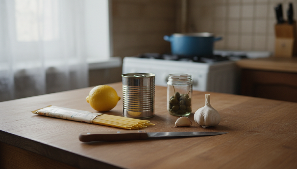 🛒 На столе: Первым делом ставим вариться пасту. Помните про параллельные процессы: пока вода закипает, у нас есть ровно 5 минут на соус. Чеснок давим ножом и мелко рубим. С лимона снимаем цедру (только желтую часть). На сковороду — немного масла, туда чеснок и цедру. Как только пошел аромат — добавляем тунца прямо из банки, предварительно слив лишнюю жидкость. «А вы бы сейчас продолжили готовить или заказали доставку?» — честный вопрос самому себе, когда стоишь у плиты после рабочего дня. Я выбираю дожат