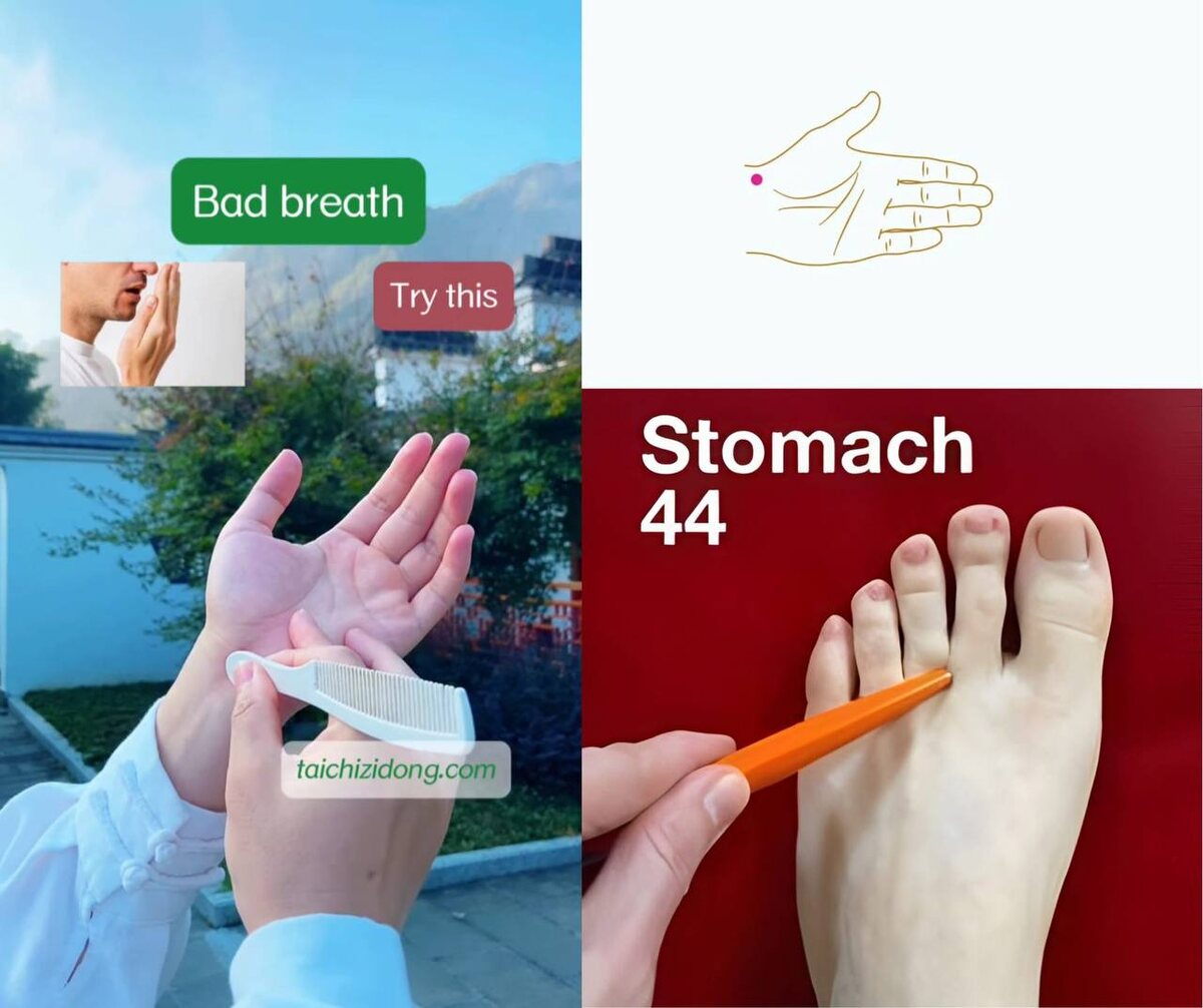 В традиционной китайской медицине плохое изо рта обычно вызвано: Общие паттерны TCM Жара желудка → сильный запах, жажда, сухость во рту, запор Застой еды → запах кислой или гнилой, вздутие, отрыжка Дефицит Сплин Ци с сыростью → сладкое или грязное изо рта, усталость Тепло легких или мокрота → сухость во рту, густая слизистая Плохая гигиена полости рта или воспаление десен (местное Цель: Очистить тепло желудка Улучшить пищеварение Преобразовать сырость и мокроту Восстановить поток Ци в желудке и Сплине 📍КЛЮЧЕВЫЕ АКУПОИНТЫ ДЛЯ ПЛОХОГО ДЫХАНИЯ Функция расположения Acupoint ST44 (Пришивание) между 2-м и 3-м пальцами ног очищает тепло желудка (очень важно) CV12 (Чжунван) Верхняя часть живота Улучшает пищеварение, уменьшает за ST36 (Zusanli) ниже колена укрепляет желудок и селезенку SP6 (Sanyinjiao) Внутренняя лодыжка преображает сырость LI11 (Quchi) Локтевая складка очищает тепло от тела LI4 (Hegu) Рука регулирует лицо и рот ✋ ТЕХНИКИ ПО УХОДУ ЗА САМОСТОЯНИЮ 1️⃣ Рутина акупресс