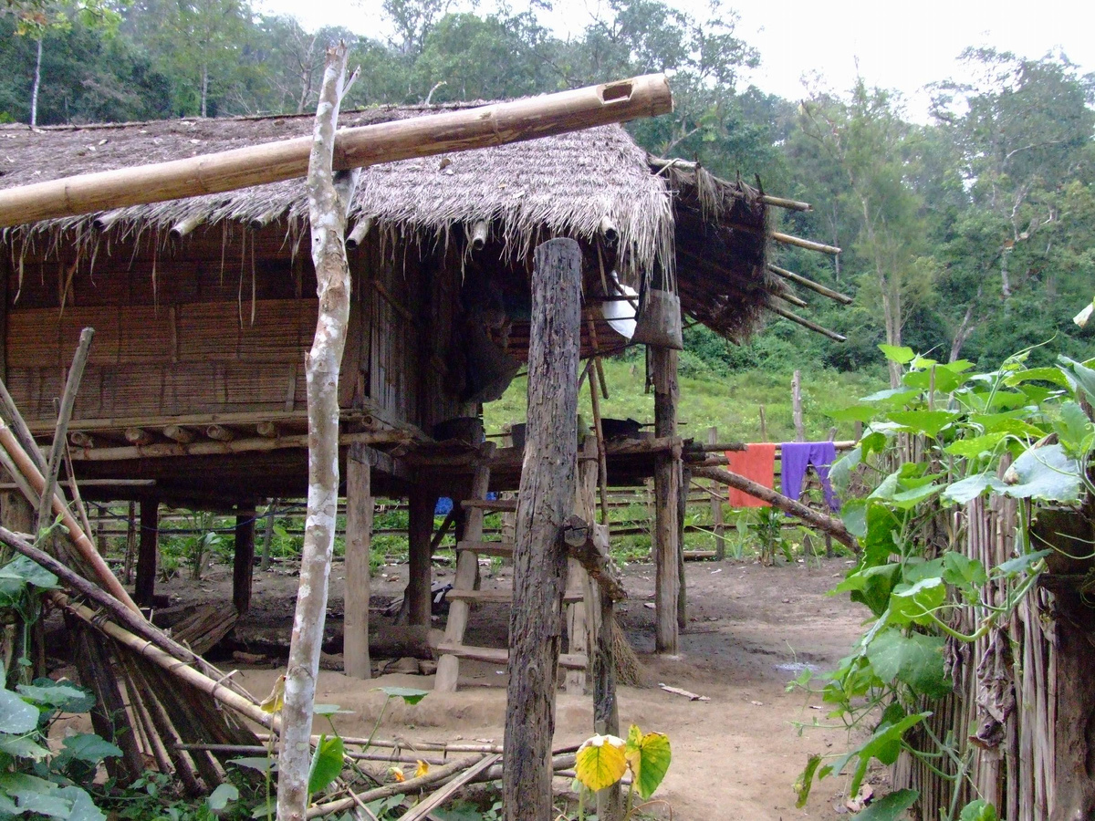 Пока в Бангкоке и туристических центрах процветают пип-шоу и прочие леди-бой, в глубинке - провинции Чиангмай страна живет по-старому. Люди строят хижины из бамбука, выращивают домашнюю живность, занимаются сельским хозяйством. Хижины из бамбука делают на сваях. Это способ защититься от грызунов и от наводнений, поскольку деревни строят на берегах рек. Дань современности в скромном интерьере - часы и какая-то странная надпись насчет обезьянки, которая не продается - вероятно, это чье-то глубокомысленное высказывание. Хозяйственные постройки включают в себя сараи, амбары и хлев. На крышах сушат злаки и пряности. Крыша сделана по интересной технологии из половинчатых бамбуковых стволов. В Чиангмае, как и везде в регионе, проживают народы, которые раньше были полукочевыми. Их образ жизни определялся способом земледелия - участок выжигали и сажали на этом месте культуру. Когда почва вокруг деревни истощалась, жители уходили искать другое место. Эти милые девушки относятся к народности пада