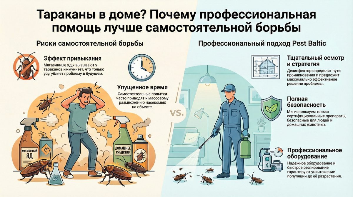 Тараканы не появляются случайно и не живут по одному. Если вы увидели даже одного — с высокой вероятностью где-то рядом уже есть колония. Эти насекомые: Чем дольше откладывать решение, тем сложнее и дороже будет избавиться от проблемы. Магазинные ловушки, гели и аэрозоли кажутся простым и дешёвым выходом. Но на практике они редко решают проблему полностью. Основные риски самостоятельной обработки: В итоге теряется время, а заражение только усиливается. Самый эффективный и безопасный вариант — обратиться к специалистам по дезинсекции. Как это работает в компании Pest Baltic: Это позволяет устранить причину, а не просто временно уменьшить количество насекомых. Многие боятся профессиональной обработки из-за детей или домашних животных. Это миф, если работать правильно. Pest Baltic использует: Все работы проводятся официально, строго по санитарным нормам и правилам. На раннем этапе: Чем раньше вызвать дезинфектора, тем проще решить проблему раз и надолго. Если у вас появились тараканы: 📞