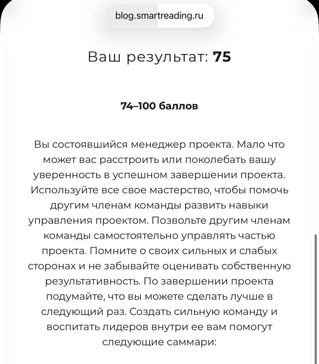 : «Какой вы проектный менеджер» Конечно, подтвердились мои слабые стороны.. есть куда расти) В этом году цель повысить свои скиллы в ряде моментов Оставлю ссылку, тем кому интересно протестировать себя: https://blog.smartreading.ru/test-kakoj-vy-project-manager