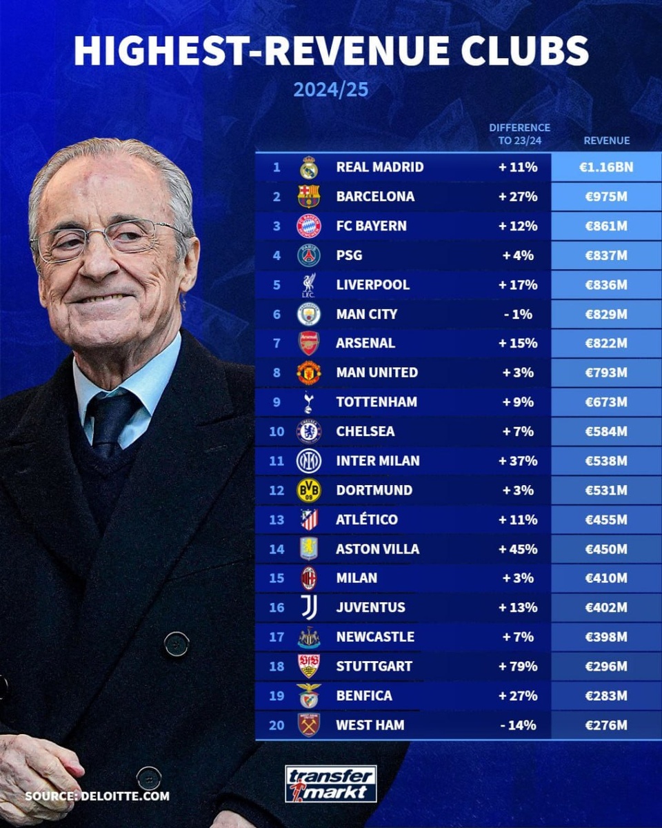 🇪🇸 Рейтинг футбольных клубов с наибольшим доходом по итогам прошлого сезона: данные Deloitte