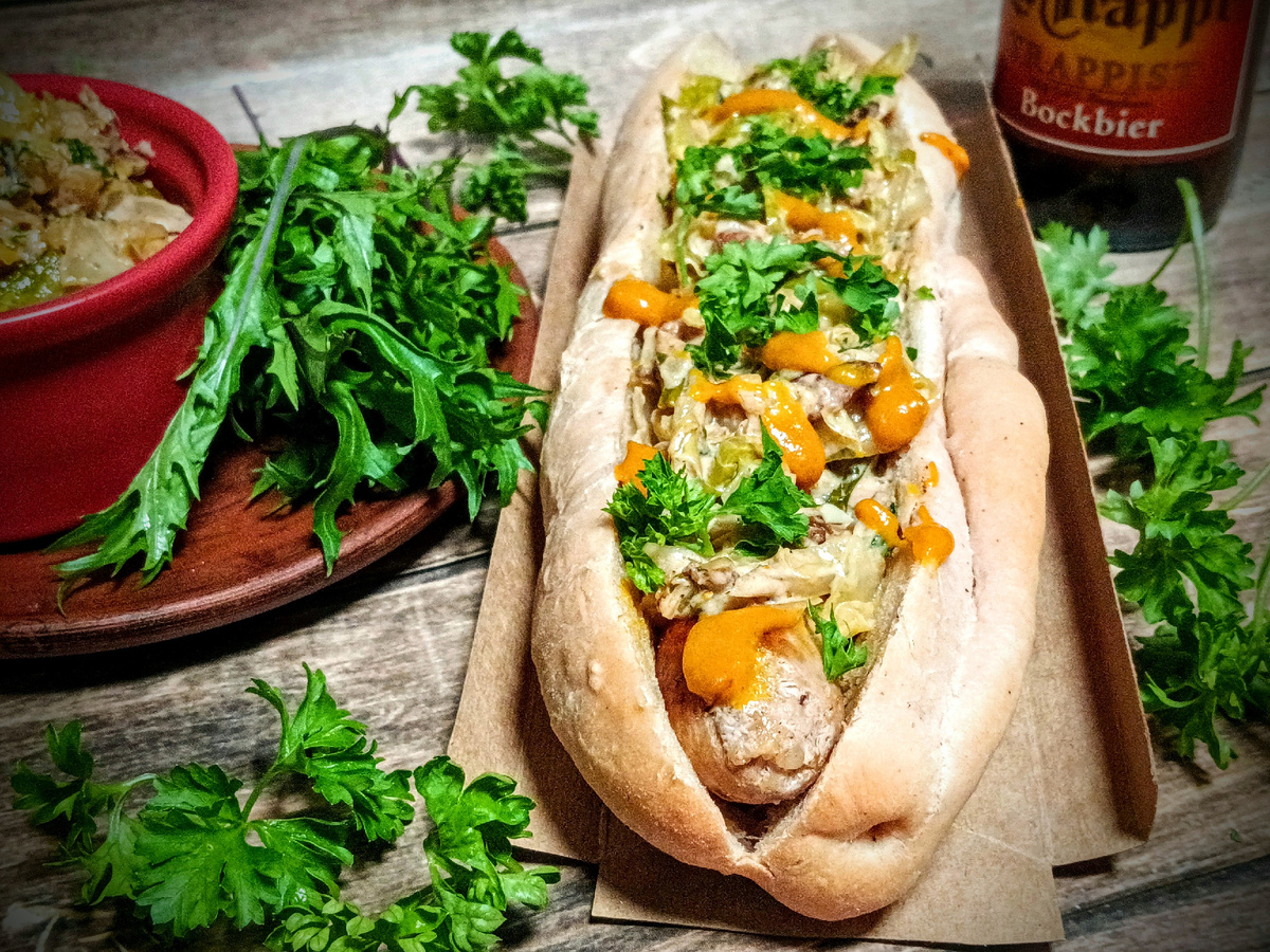 Хот-дог с вкуснейшей капустой, в которой собрались многообразие вкусов и текстур. Сладость сыра грюйер, немного солоноватости бекона и нежность крем-чиза. А колбаску польем соусом на основе желтой горчицы с медом и легким привкусом цитрусовых. 7 булочек