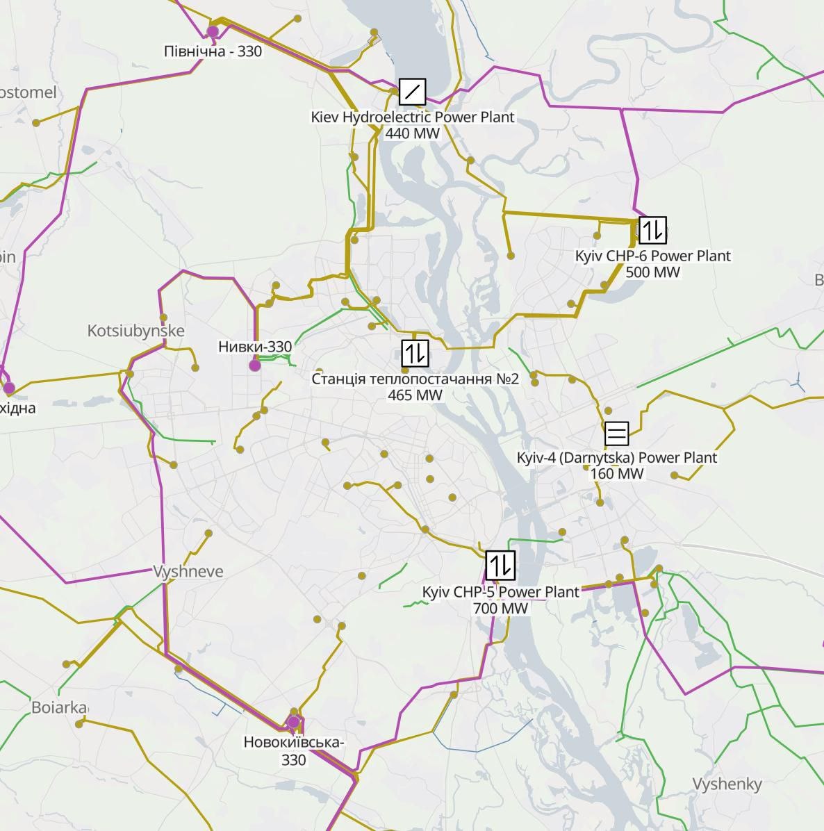 ? Всего в Киеве и окрестностях находится около трёх десятков различных подстанций, питающих как сам город, так и пригороды. Переток электроэнергии в город идёт по нескольким ключевым подстанциям: ▪️Западная (330 / 110 / 35 кВ) ▪️Северная (330 / 110 / 10 кВ) ▪️Новокиевская (330 /110 / 10 кВ) ▪️Броварская (330 / 110 /35 / 10 кВ) Так или иначе они были связаны с Трипольской ТЭС, функционирование которой под большим вопросом. Часть энергии в какое-то время забирали с Каневской ГЭС, но и её полноценная работа больше невозможна, как и нормальный переток электроэнергии. Также при необходимости подключались и другие средства генерации. Частично Киев забирает электричество через ЛЭП по линии подстанций Северная - 330 - и Минская 110, которые, в свою очередь, тянутся от Ровенской АЭС. Есть и другая линия — она подключена от Хмельницкой АЭС через протяжённую ЛЭП, подстанцию Шепетовка (330 / 110 / 35 / 10 кВ) и Житомир к подстанции Новокиевская и ТЭЦ-5. То есть система эта многоуровневая и ч
