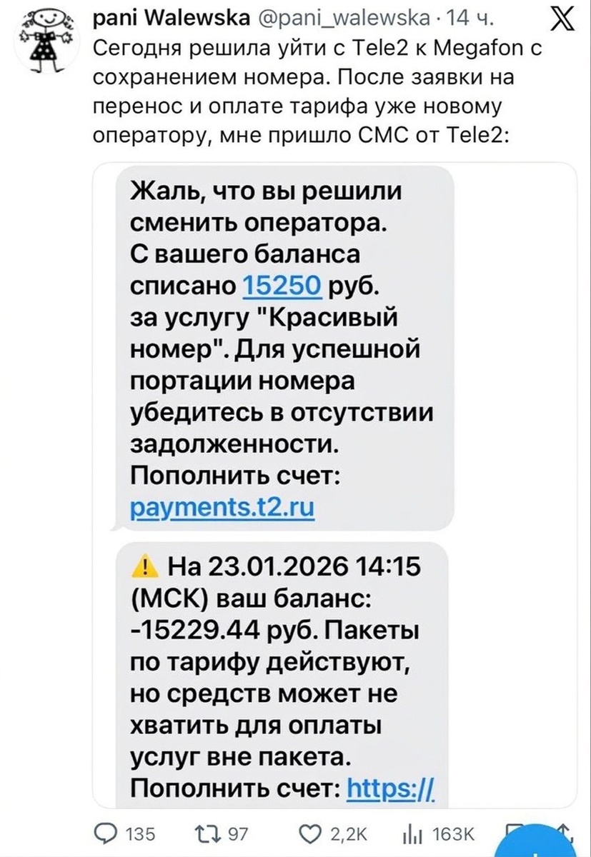 💸С такой ситуацией столкнулась пользовательница при переходе в Мегафон: ей выставили счет, хотя она пользуется номером 15 лет и никогда не покупала особых комбинаций цифр. ✅В Мегафоне девушке подтвердили, что ее номер — самый обычный. Как выяснилось, «красивыми» у Tele2 теперь могут считаться почти все номера, а огромный долг аннулируется сам собой, если клиент передумает уходить и вернется к старому оператору. 📌Юристы поясняют, что правило «хочешь уйти — заплати» не имеет законных оснований: всё зависит от условий договора. Если оператор дал скидку на «красивый номер» при условии пользования связью определённый срок, то при досрочном расторжении эта льгота может быть аннулирована. ⚠️Если же списание происходит только из-за смены оператора, это нарушение прав потребителя. В таких случаях стоит жаловаться в Роспотребнадзор или ФАС.