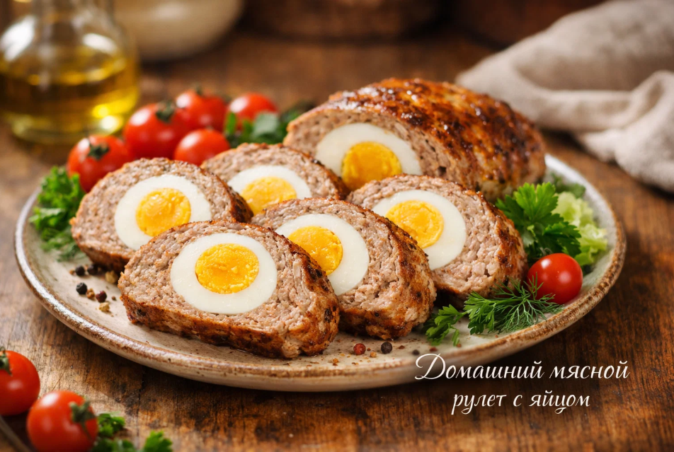 Есть блюда, которые готовишь по праздникам, а есть те, что становятся настоящей семейной классикой. Мясной рулет с варёными яйцами внутри относится именно ко второй категории. Когда нарезаешь его на порционные куски и видишь этот аккуратный кружок белка с ярким желтком в центре каждого ломтика, понимаешь — вот оно, настоящее кулинарное волшебство без лишних сложностей.