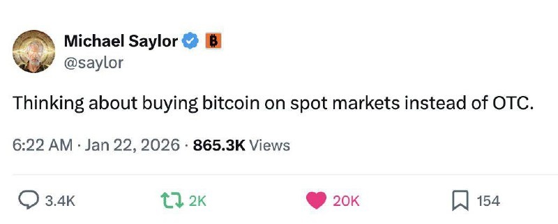 И это важнее, чем кажется. Сегодня Michael Saylor бросил фразу, которую легко пролистать — но сложно переоценить: он думает о покупке биткоина через спот-рынок, а не через OTC. На поверхности — техническая деталь. По сути — маркер фазы рынка. OTC используют, когда на рынке достаточно предложения. Когда есть продавцы, готовые отдать крупные объёмы без движения цены. Это режим тихого, аккуратного накопления. Если один из крупнейших и самых терпеливых покупателей BTC публично говорит о споте — значит, предложение в OTC сжимается. Купить «незаметно» становится всё сложнее. Покупка через спот — это осознанное давление на цену. Это сигнал: рынок должен переварить спрос, а не спрятать его. Так действуют не спекулянты, а структурные покупатели, которые понимают, что дальше актив будет доступен только дороже. Здесь важно ещё одно. Эта фраза сказана публично. Это не кулуарное решение, а сообщение рынку и институционалам: биткоин постепенно выходит из зоны комфортного накопления и входит в