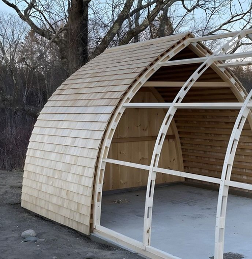 - интуитивной последовательности монтажа. Этапы работ логично следуют друг за другом: установка фундамента → монтаж арочных секций → обшивка → утепление → отделка;
