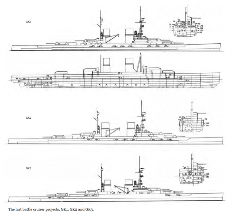 Все три варианта (GK 1, GK 2 и GK 3) предусматривали одинаковое вооружение: восемь 380-мм орудий в четырёх двухорудийных башнях, шестнадцать 150-мм пушек, восемь 88-мм зениток и пять 600-мм торпедных аппаратов. Бронирование в целом повторяло схему «Макензена», за исключением незначительных отличий. Например, GK 1 имел нормальное водоизмещение 34 000 т, мощность 110 000 л.с. и скорость 29,25 узла; GK 2 — 38 000 т, 120 000 л.с., 29,5 узла; GK 3 — те же размеры, что и у GK 2, но с усиленными барбетами (350 мм вместо 300 мм) и сниженной мощностью до 115 000 л.с., что давало всего 29 узлов.