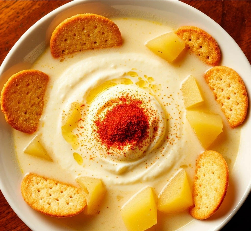ИНГРЕДИЕНТЫ (на 2 порции): 🧾 ·Плавленые сырки («Дружба» или специальные для супа) — 2 шт. (около 160 г) 🧀🧀 ·Картофель — 2 шт. (средние) 🥔 ·Вода или овощной бульон — 500 мл ·Сливки 10% — 50 мл (изюминка бархатистости!) ✨ ·Укроп или петрушка — небольшой пучок 🌿 ·Сухарики из белого хлеба — для подачи. ·Копчёная паприка — для посыпки.