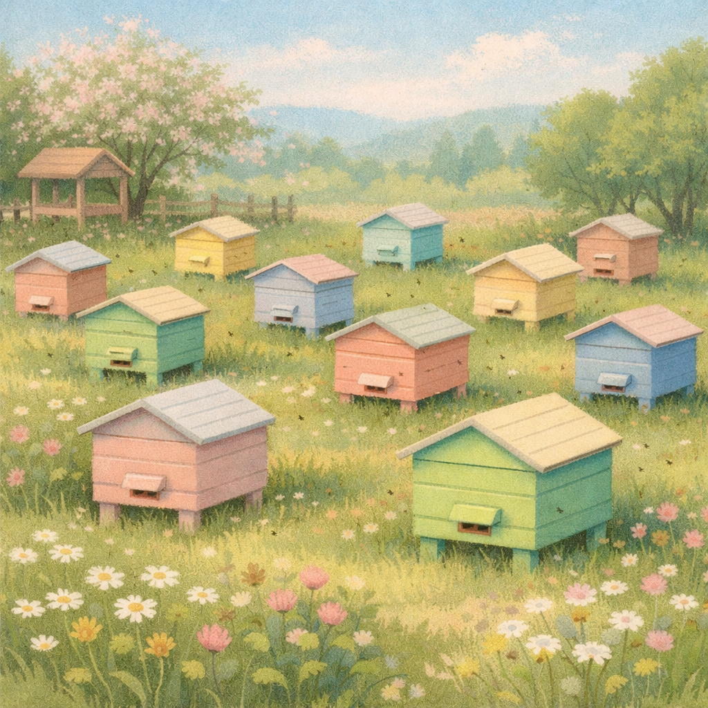 Правильная расстановка ульев и их окраска — это основа спокойной, продуктивной пасеки. Эти приёмы напрямую влияют на ориентацию пчёл, силу семей, уровень воровства, агрессию и общий медосбор. Часто проблемы на пасеке связывают с породой пчёл или погодой, но на практике причина нередко кроется в неправильной организации пространства. Улей для пчелы — это точка возврата, центр мира. Если пасека организована хаотично или, наоборот, слишком однообразно, пчёлы начинают теряться. Правильная расстановка позволяет: Пчёлы используют сразу несколько ориентиров: Если большинство ориентиров одинаковы, навигация даёт сбой. Распространённая ошибка начинающих — выстроить одинаковые ульи ровной линией, покрасив их в один цвет. Последствия: Для пчёл такие ульи выглядят как один и тот же дом. Пчёлы хорошо различают цвета, особенно: Разная окраска помогает пчеле: Не обязательно перекрашивать улей целиком. Достаточно: Даже такое простое различие резко снижает залёт пчёл. [ ] [ ] [ ] [ ] [ ] [ ]