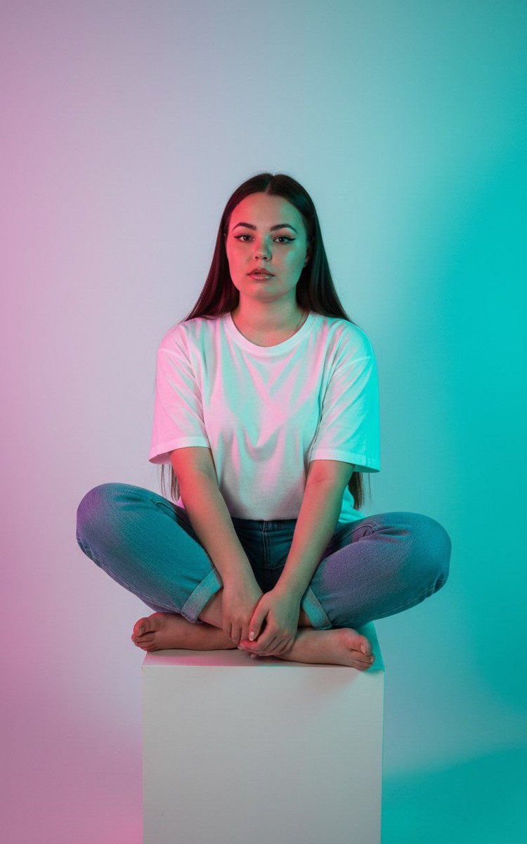Макияж-нюд, естественные выразительные ресницы тонкие черные стрелки. Контуринг, акцент на скулах. Губы покрыты нюдовым оттенком помады и блеском. Молодая женщина сидит, скрестив ноги, на белом кубе; босые ступни и руки сложены на колене. Одежда: свободная белая футболка и светло‑голубые джинсы с подворотами. Длинные прямые волосы свободно падают на плечи. Освещение: драматическое неоновое двухцветное — насыщенный розово‑малиновый (magenta) с одной стороны и бирюзово‑голубой (cyan) с другой, создающие яркий градиент на фоне и цветные рефлексы на коже и ткани; мягкие, слегка растушёванные тени и чёткая цветная тень на стене. Композиция: медиум‑полный кадр (3/4), камера на уровне сидящего, лёгкое смещение в сторону для объёма. Стиль: кинематографичный, высокое разрешение, реалистичная текстура кожи и ткани, мягкое боке, лёгкая пленочная зернистость, естественные пропорции и материалы. Технические замечания: объектив ~50mm, f/1.8–2.8, низкое ISO, аккуратная цветокоррекция с удержанием бал