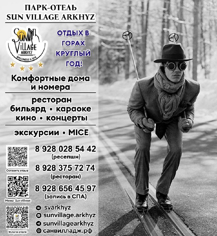 »! Дорогие гости! Приглашаем Вас в горы Архыза на Софийскую поляну где расположен наш отель. Эта памятка разработана для вашего удобства и поможет вам больше узнать об услугах, предоставляемых в отеле. Мы надеемся, что ваше пребывание в парк-отеле «SUN VILLAGE Arkhyz» будет незабываемым! ———————— ✏ Услуги и удобства ⦁ Свободный Wi-Fi на всей территории отеля. ⦁ Бесплатные парковочные места перед гостиничным корпусом, рестораном и домами (круглосуточное видеонаблюдение). ⦁ Детская площадка для маленьких гостей. ⦁ Костровая зона и мангальные зоны — для получения инвентаря (шампура, решетки) обращайтесь к сотрудникам ресторана. ———————— ✏ Ресторан «SUN VILL rest» Ресторан работает с 9:00 до 23:00 (последний заказ на кухню — 21:30). Мы рады видеть вас на Welcome-зоне нашего уютного ресторана! ⦁ «Витаминка» с 11:00-11:30 «МультиПульти»: 11:00-12:00 -на большом экране мультфильмы для наших маленьких гостей и порция свежих овощей. ⦁ «Айран час» каждую пятницу и субботу с 17:00 до 18: