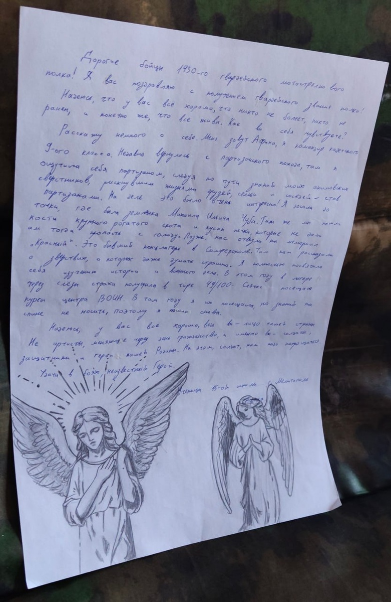 ! Пишет тебе солдат из 1430 гвардейского полка. Очень приятно было получить от тебя письмо, да еще и такое красивое! Спасибо тебе большое за поздравление! Стать гвардией было очень почетно для нас. Много сил ушло, труда, пота и крови пролито, чтобы отстоять вверенные командованием рубежи. Отстояли, как ты знаешь. Вот теперь гвардейцы. Приятно. Ответственно. «Командир Афина» — это ого-го как звучит! Ты уже в 9 классе, и наверняка помнишь историю Древней Греции и их богов и богинь. Афина Паллада могла и сама посражаться, и героев вдохновить как следует. Думаю, тебе в кадетском классе, где все ребята и девчата не робкого десятка, совсем не скучно. Вы большие молодцы, что изучаете историю и военное дело. Партизаны в Великую Отечественную войну были огромной и могучей силой, наводившей такой страх и ужас на гитлеровских бандитов, что те, кто послабее, только пятками сверкали при одном слухе, что партизаны идут. Фашистское командование отправляло на борьбу с партизанами многочисленные от