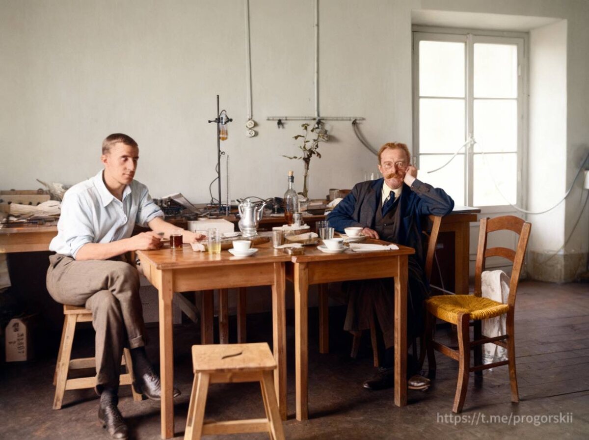 ». 1930 год. Этот кадр переносит нас в парижский период жизни великого пионера цветной фотографии. После революции Прокудин-Горский основал в столице Франции семейное фотоателье с поэтичным названием «Ёлка», где вместе с ним работали его сыновья. На фотографии мы видим мастера и его сына Михаила в рабочей обстановке лаборатории, погруженных в творческий процесс вдали от родины. #автор Ещё больше фотографий: ____________ Telegram | ВК | MAX | Дзен | Пикабу